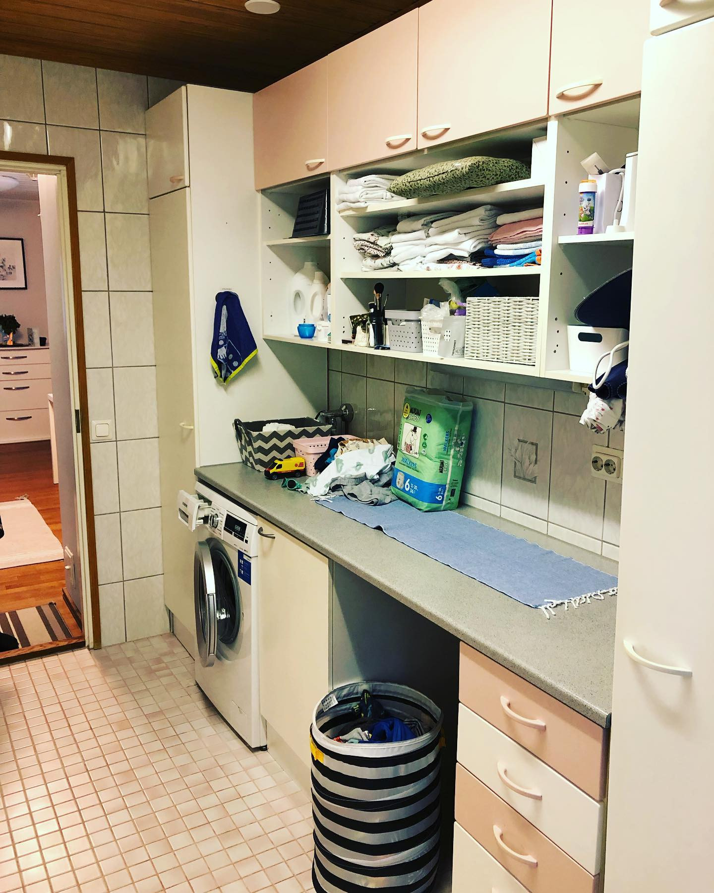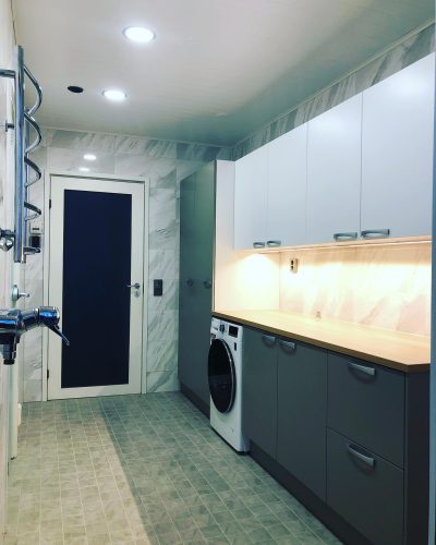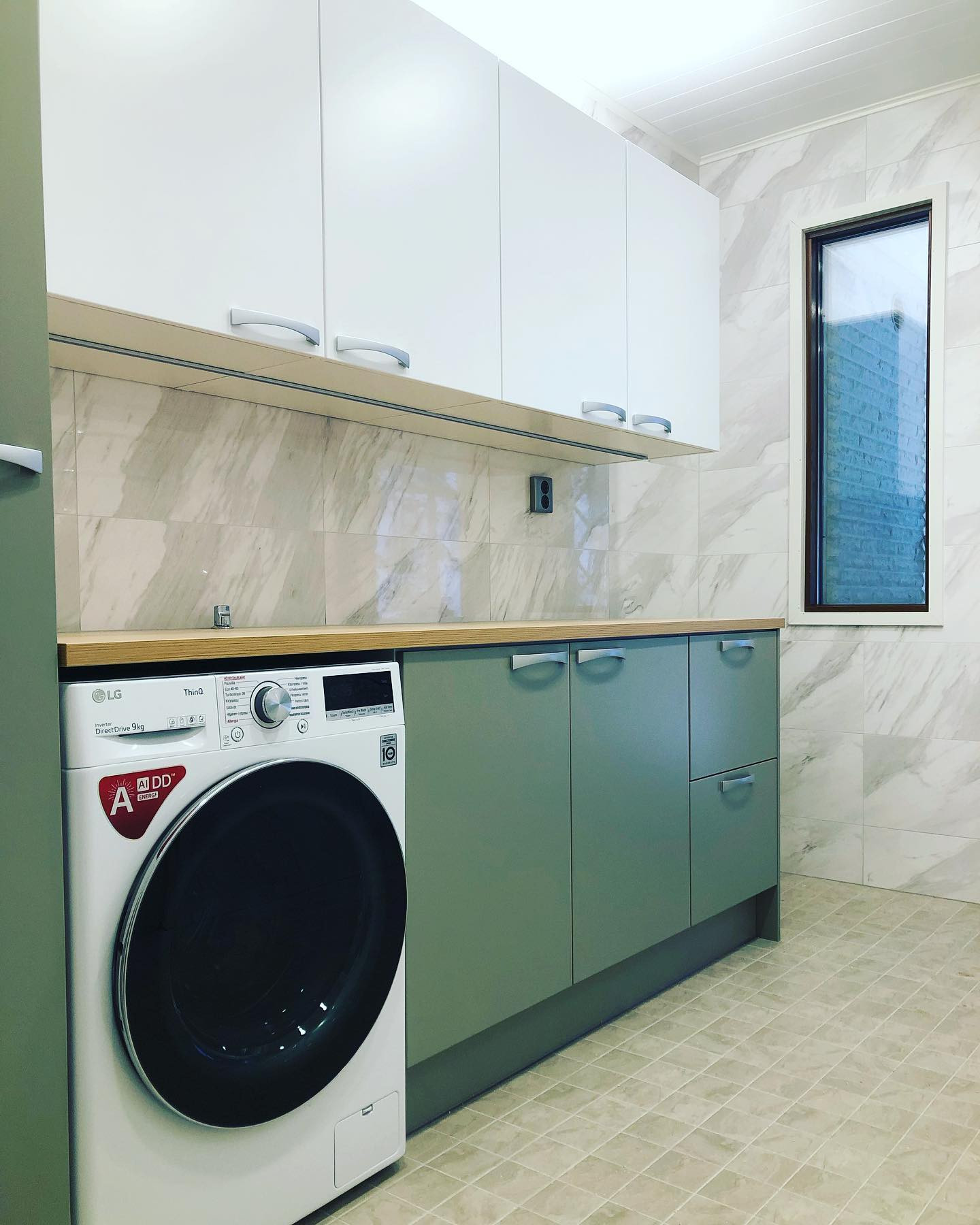 Kodinhoitohuoneeseen uuden ajan värityksiä. Oliivin väriset kalusteet tuo kivasti väriä vaalean marmoripinnan viereen #m…